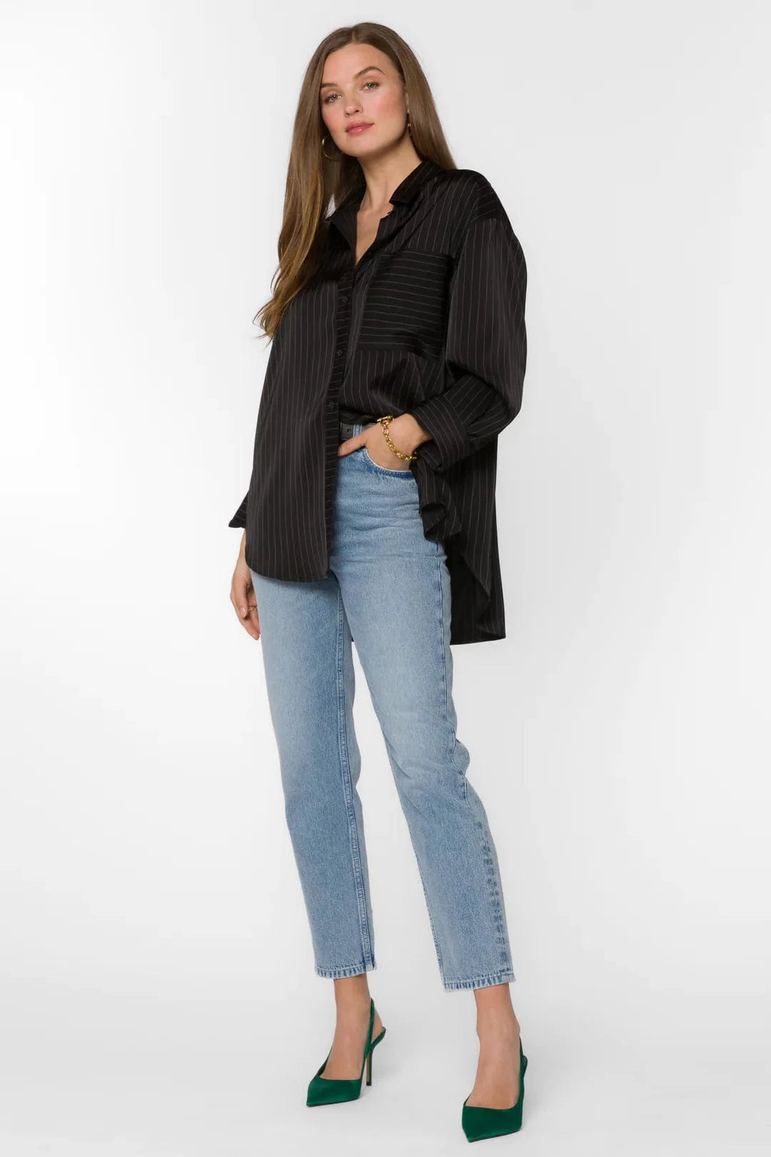 Elevate your wardrobe with the Velvet Heart Sutton Button Down Top. Featuring a soft pinstripe print and an oversized fit, this shirt blends timeless style with modern ease. The drop shoulder detail adds a contemporary edge, making it perfect for a chic, effortless look that effortlessly stands out. Whether dressed up or down, this top is designed to turn heads with its sophisticated appeal.