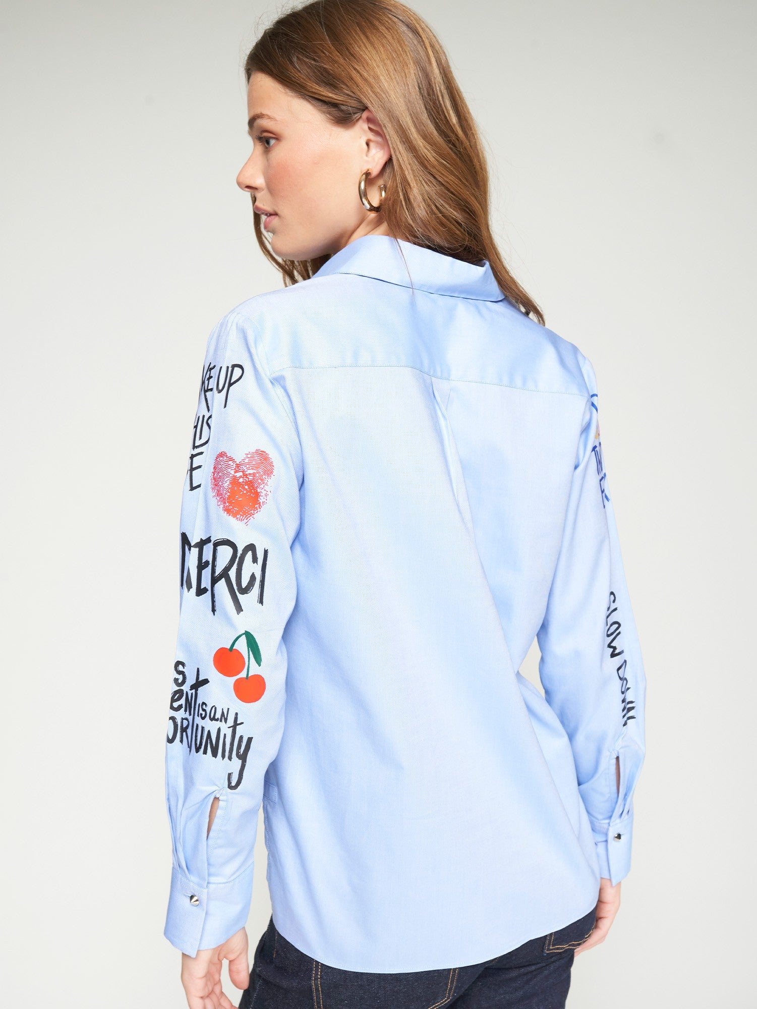 Crafted from 100% cotton, the Vilagallo Isa Graffiti Button Down Blouse combines comfort with style. Playful screen-printed texts and illustrations adorn the front and sleeves, adding a unique artistic touch. Its classic shirt collar, visible button front closure, straight cut, slightly rounded hem, and buttoned cuffs offer a polished yet relaxed fit perfect for any occasion. Elevate your wardrobe with this standout piece that balances casual charm and refined detail.