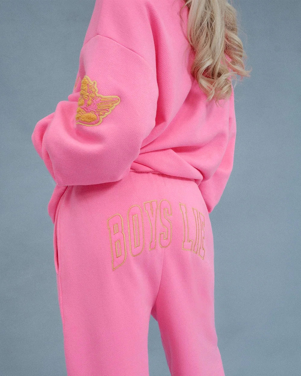 Step out in style with the Boys Lie Not Your Puppet Kimmy Pants. Featuring a vibrant hot pink color and our signature golden cherub embroidery, these sweatpants combine boldness with cozy comfort. Perfect for making a statement while staying relaxed, they deliver a unique blend of standout fashion and everyday wearability.