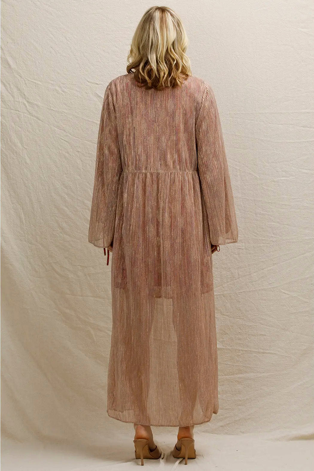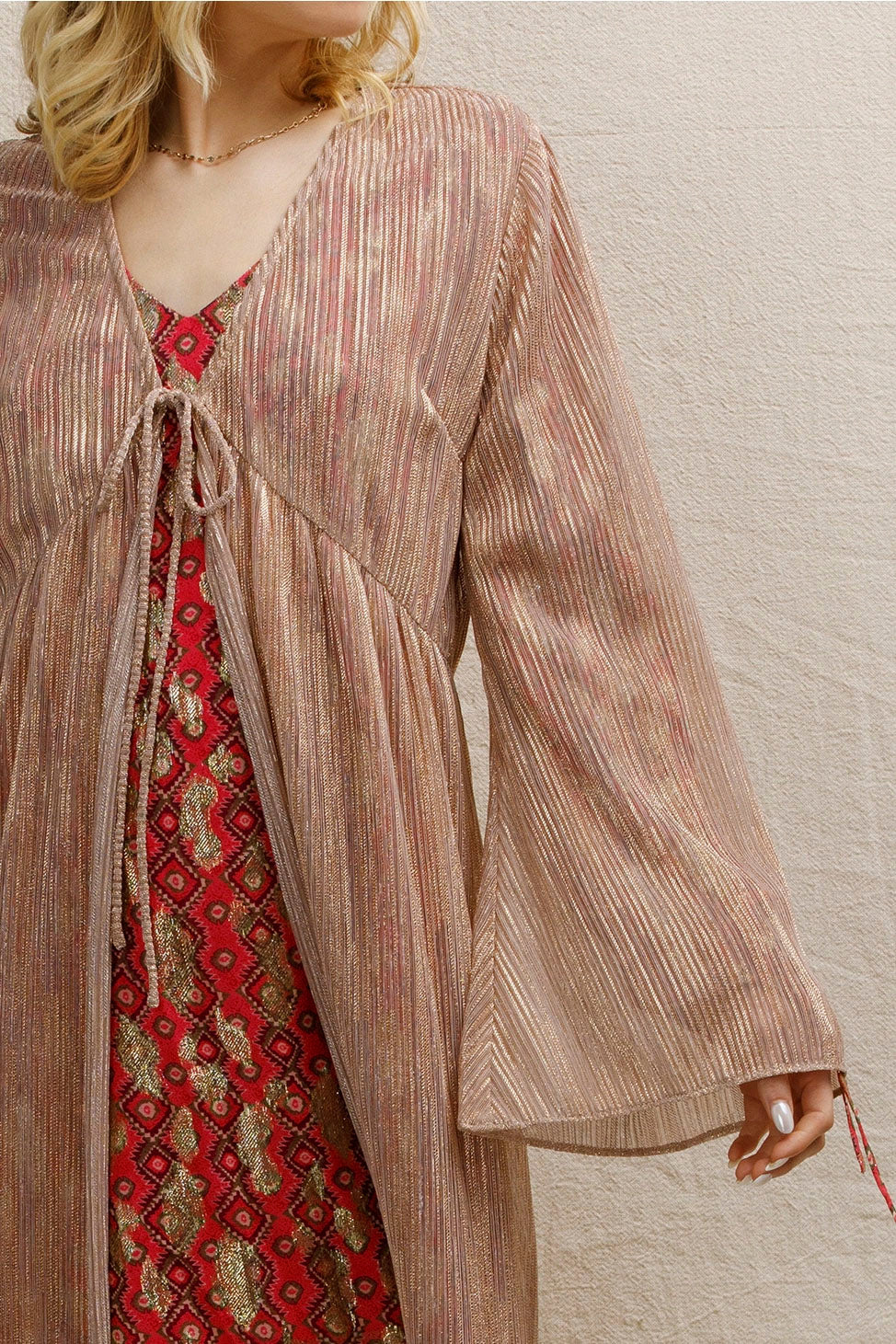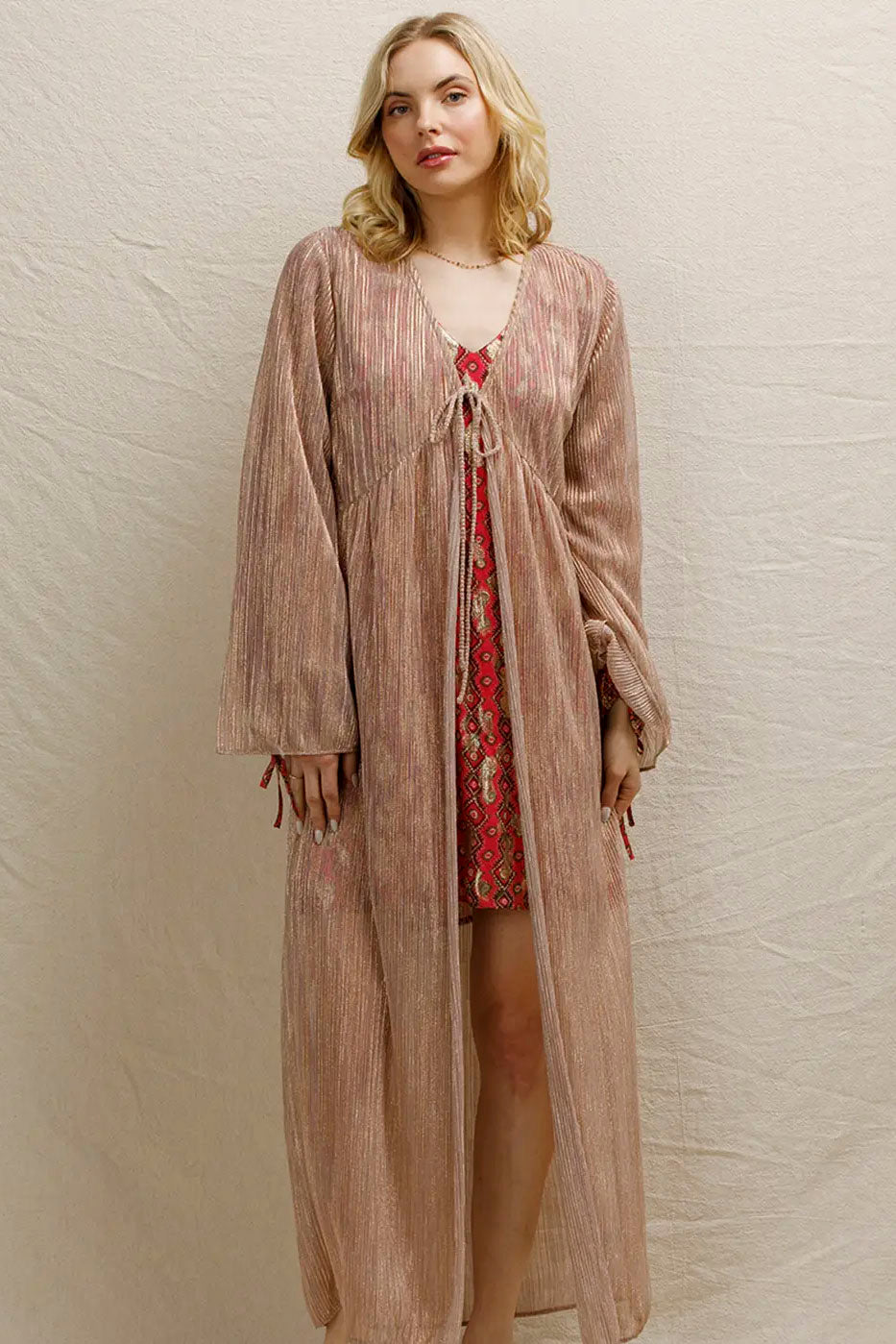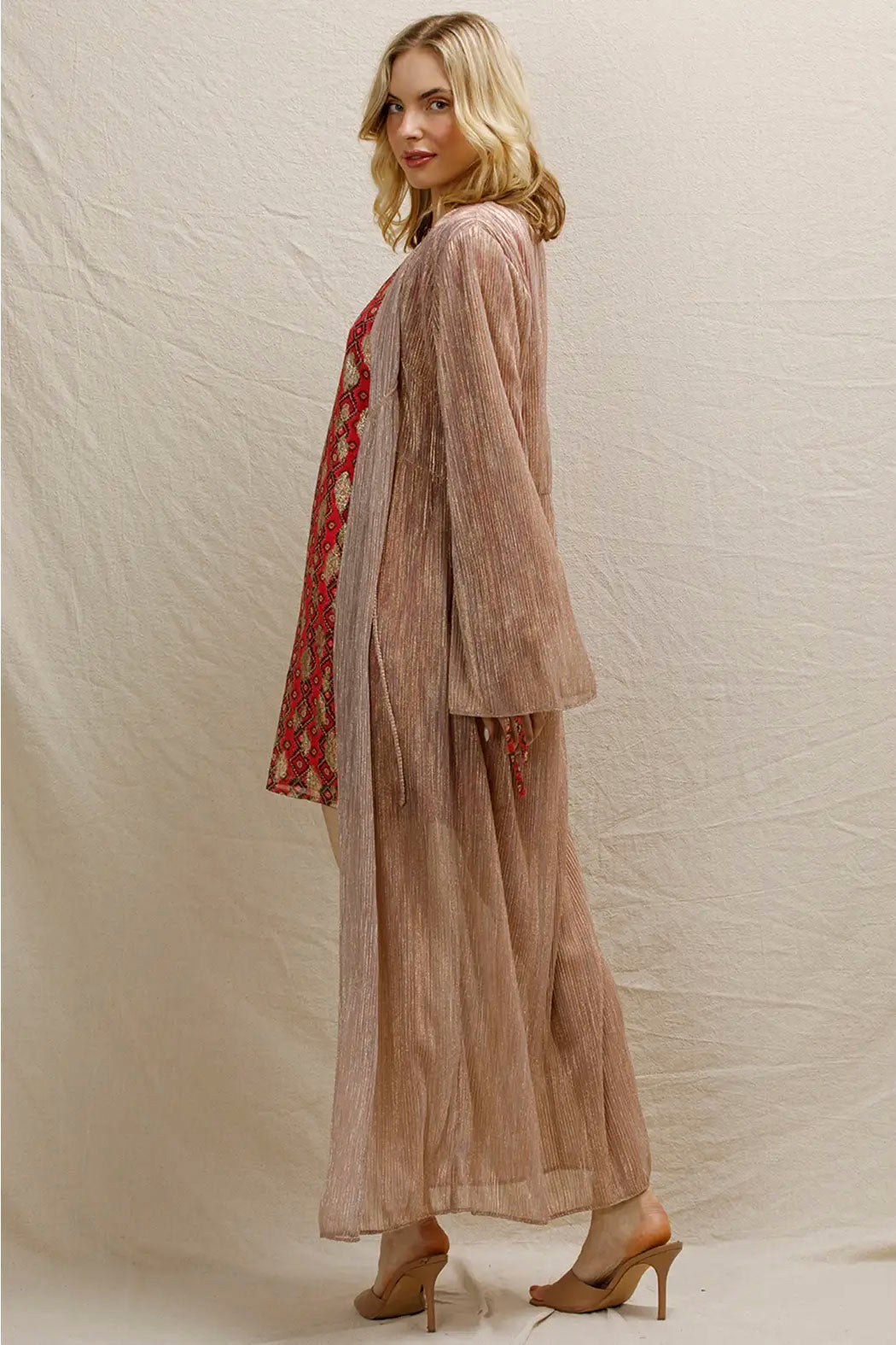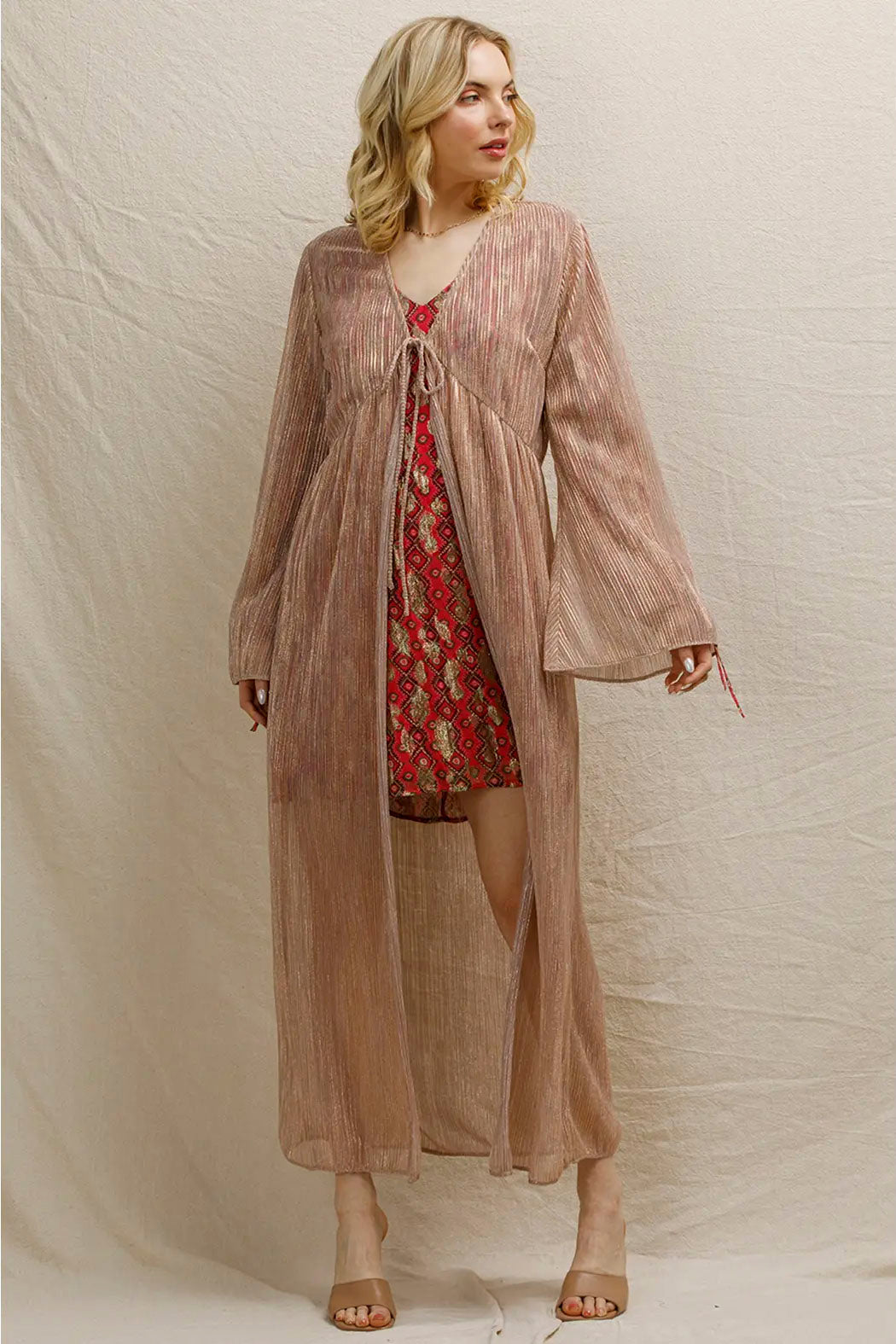Elevate your style with the Talk to Angels Sheer Shimmer Kimono in radiant rose gold. This maxi jacket adds a delicate, luminous layer to any outfit, effortlessly enhancing your look with its lightweight, flowing fabric. Perfect for both day and night, its shimmering finish brings a touch of elegance and glamour, making every moment feel special. Add this versatile piece to your wardrobe and shine wherever you go.