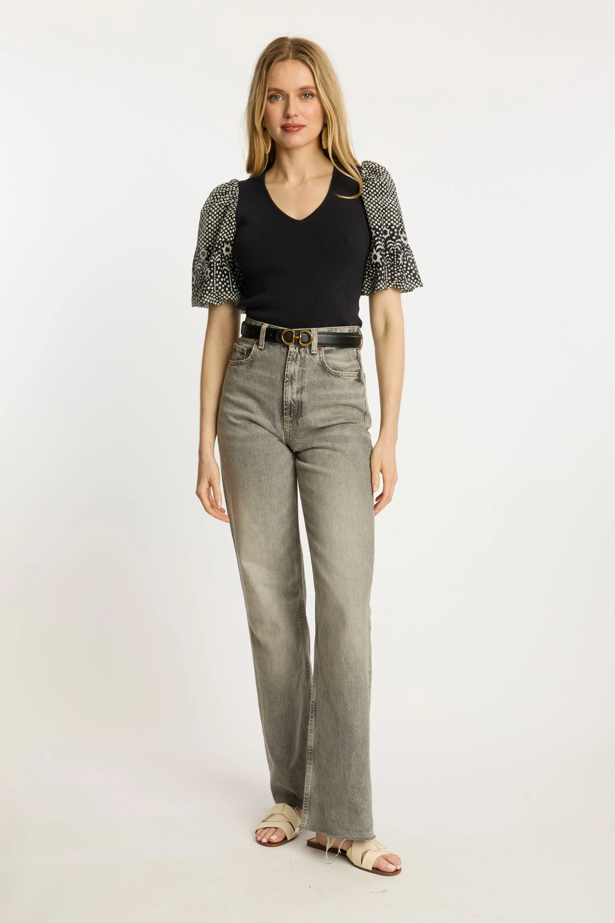 The Caballero Andrea Top is where contemporary elegance meets artistic flair. Featuring a sleek dark navy knit body paired with voluminous puff sleeves in our signature Indigo Dot print, this piece delivers instant visual interest without sacrificing wearability. The fitted silhouette creates a flattering shape, while the airy printed sleeves introduce a bohemian edge that feels fresh and modern. Crafted from a comfortable stretch knit with luxurious silk-cotton sleeves, it moves with you throughout your day. Whether you're dressing it down with your favorite jeans or elevating it with tailored trousers, the Andrea Top adapts effortlessly to your style. A versatile essential that transforms any wardrobe.