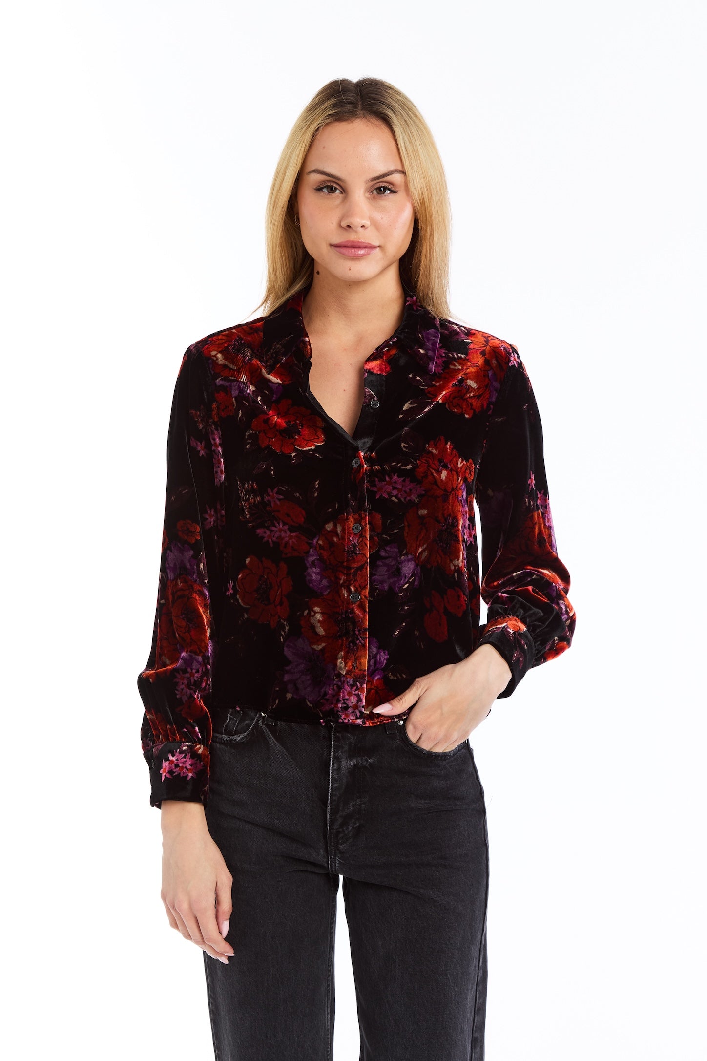 Elevate your wardrobe with the Drew Alexa Shirt, a sophisticated piece that combines luxurious comfort with timeless style. Featuring a sumptuous velvet feel fabric and an elegant dark floral print, this long-sleeve button-up delivers both visual interest and tactile indulgence. Perfect for layering or wearing solo, it transitions seamlessly from casual days to evening occasions. The classic button-front design offers effortless versatility, while the rich texture and moody botanical pattern create an instantly polished look that sets you apart.