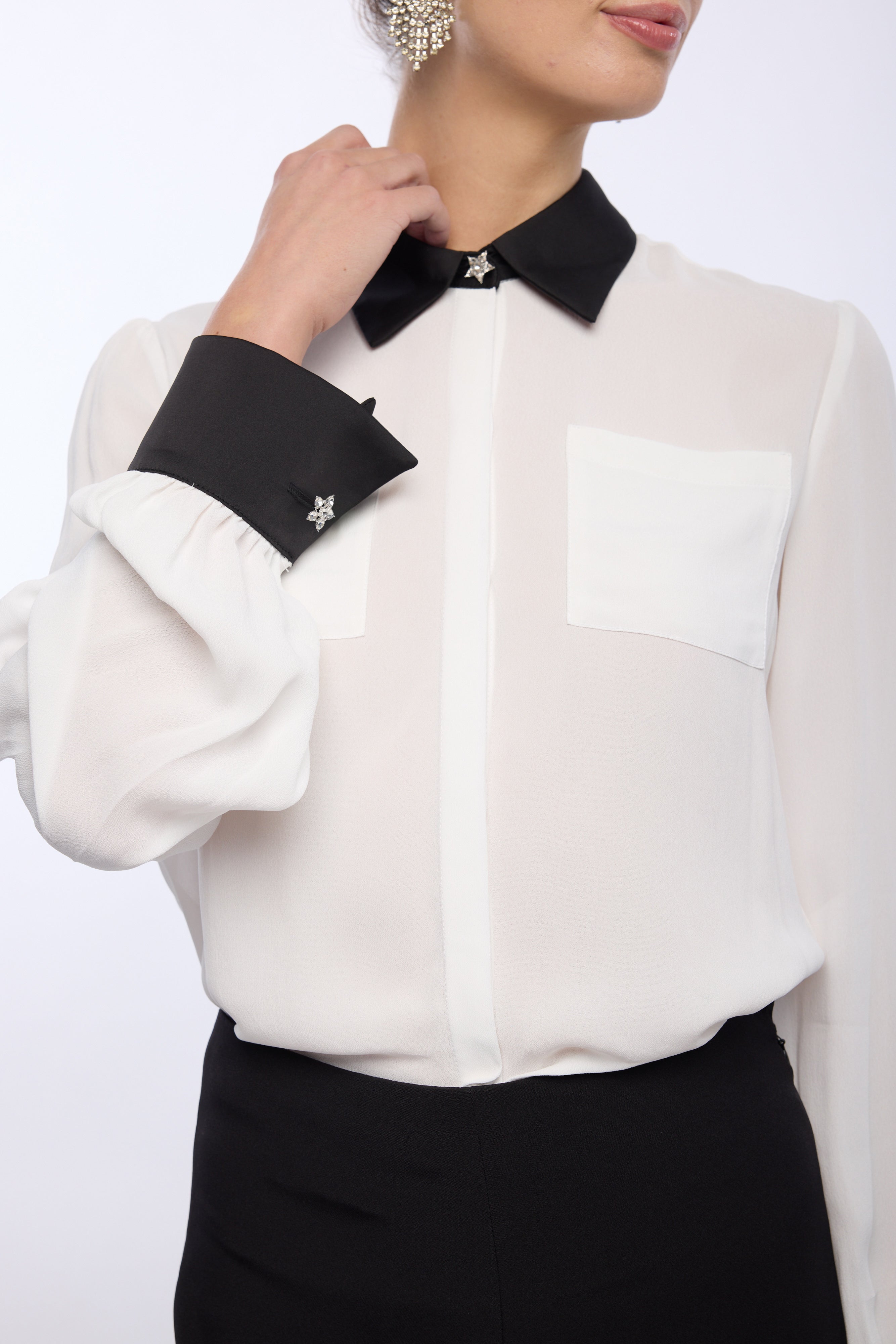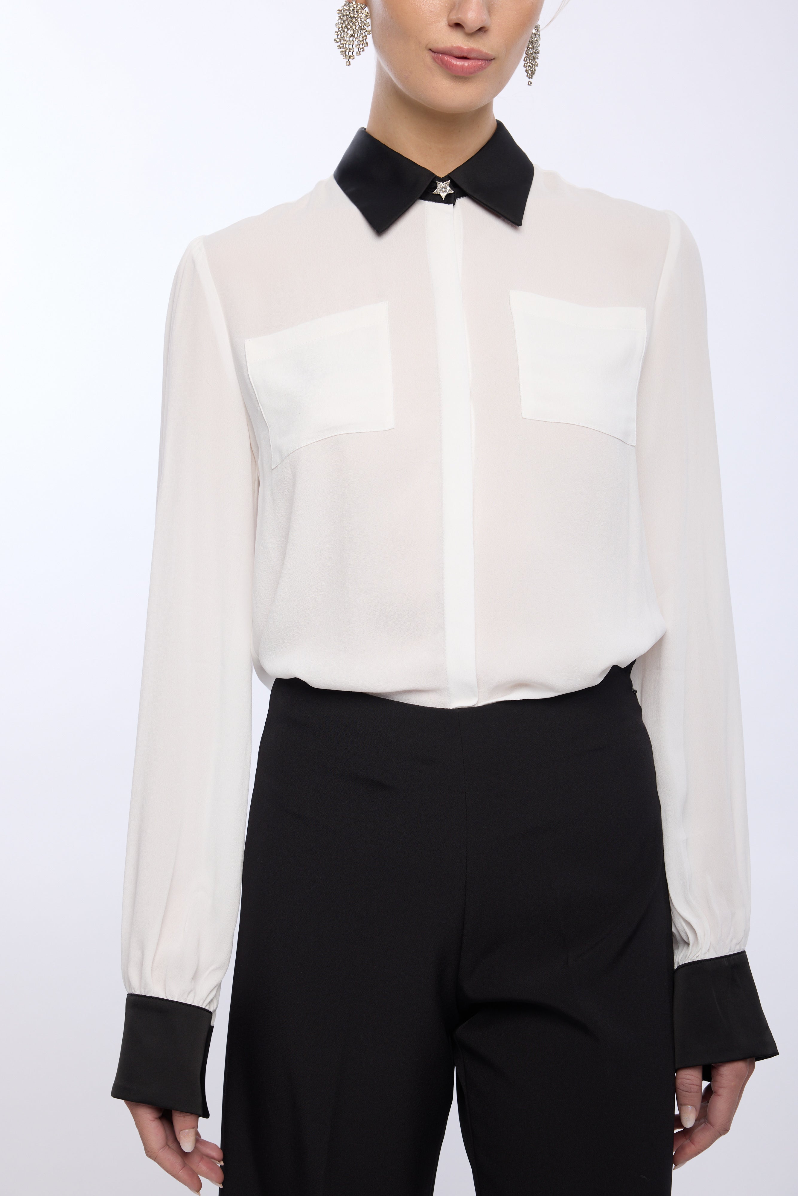 Elevate your wardrobe with the Generation Love Denise Satin Combo Blouse, a sophisticated piece that seamlessly blends luxury and ethics. Crafted from vegan silk double georgette, this button-down shirt delivers a fluid drape and refined texture without compromising your values. The striking satin collar and cuff combo adds an unexpected touch of elegance, transforming this versatile piece from boardroom essential to evening-ready statement. Perfect for those who refuse to choose between style and sustainability, this blouse proves that conscious fashion never looked so good.