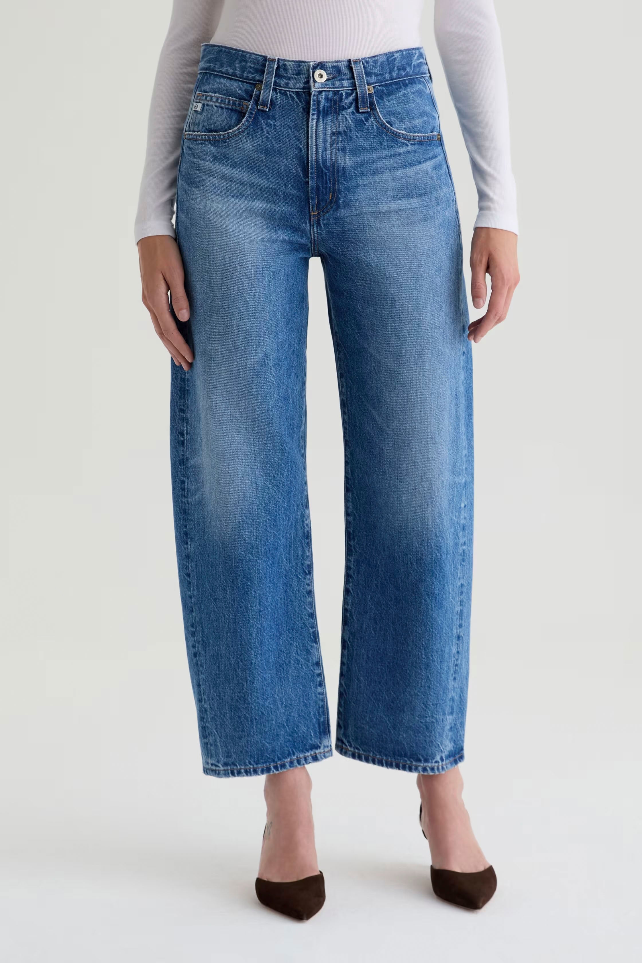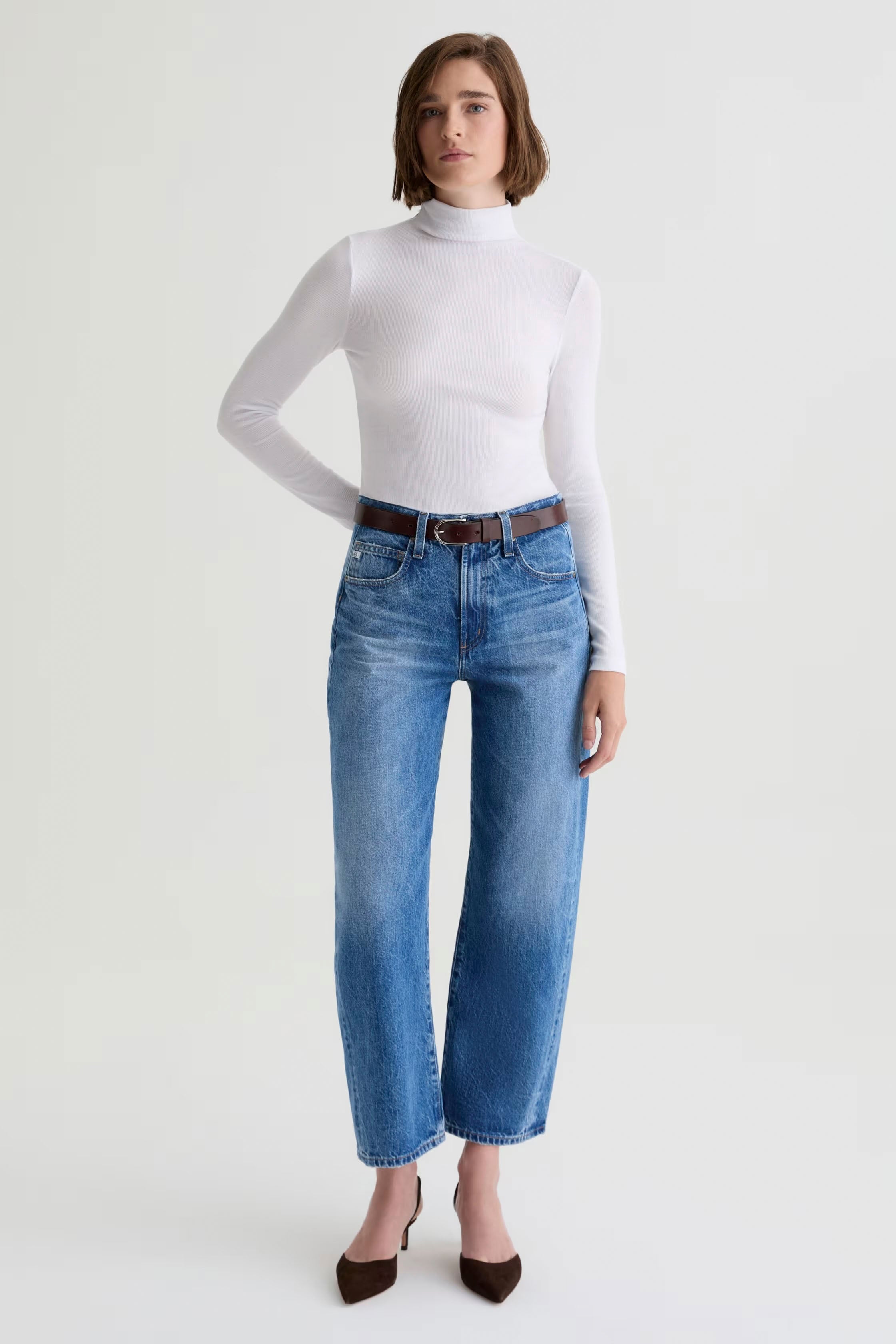 Elevate your wardrobe with the AG Jeans Hattie High Rise Barrel, featuring a modern high-rise fit and a distinctive curved silhouette highlighted by side seam paneling. Crafted from durable 13 oz. Sioux Rigid Denim, these jeans offer lasting quality and style. The cropped ankle and wide hem create a flattering, on-trend look, while classic five-pocket styling ensures versatility and everyday comfort. Perfect for those seeking a chic, fashion-forward denim that stands out with timeless appeal.
