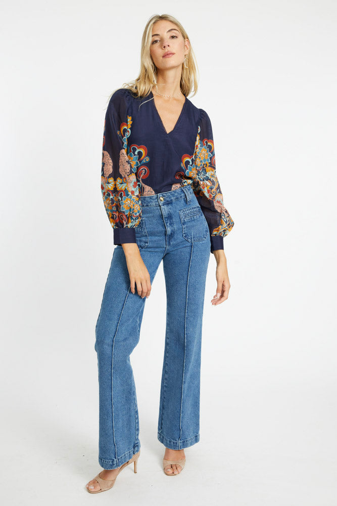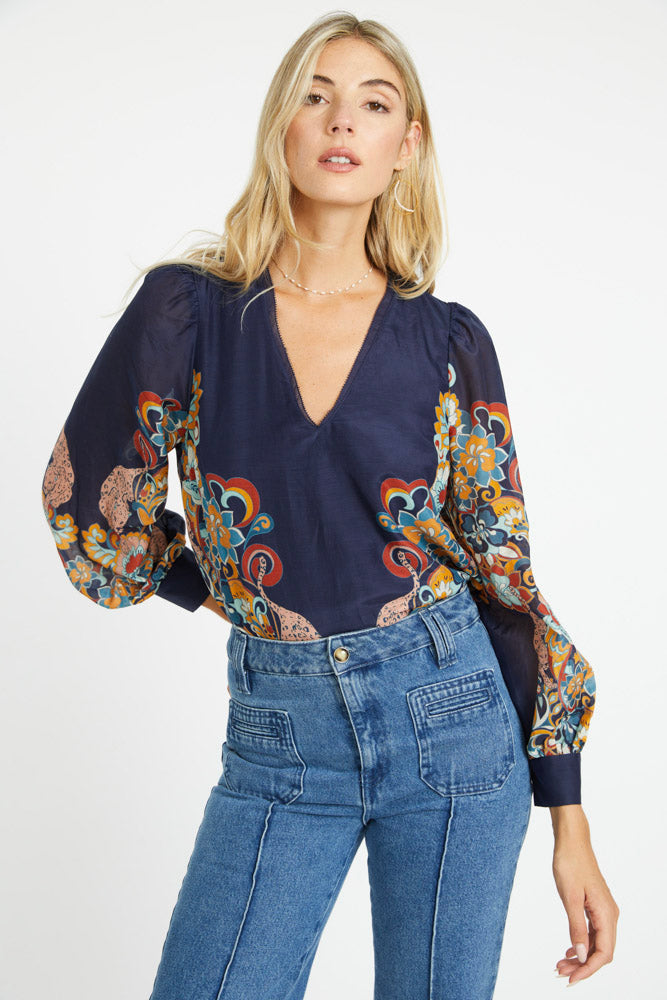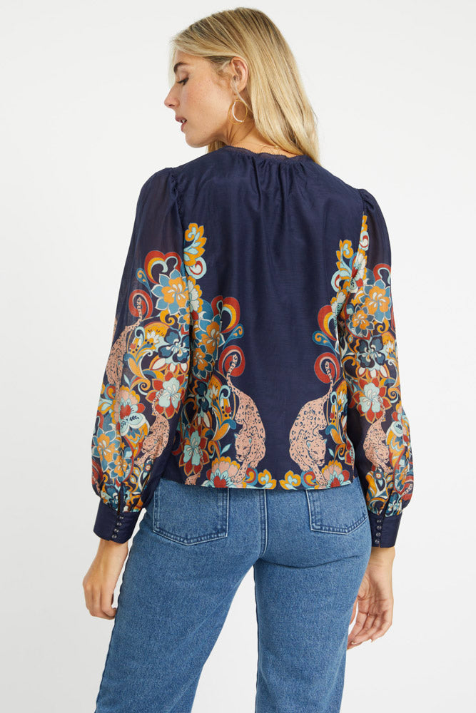 Unleash your wild side with our Caballero Ruby Blouse! Made from a luxurious cotton silk blend, this long sleeve, v-neck blouse features a stunning floral print with cheetahs for a touch of exotic glamour. Perfect for adding a pop of boldness to any outfit.