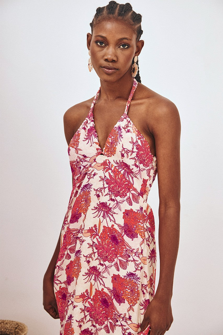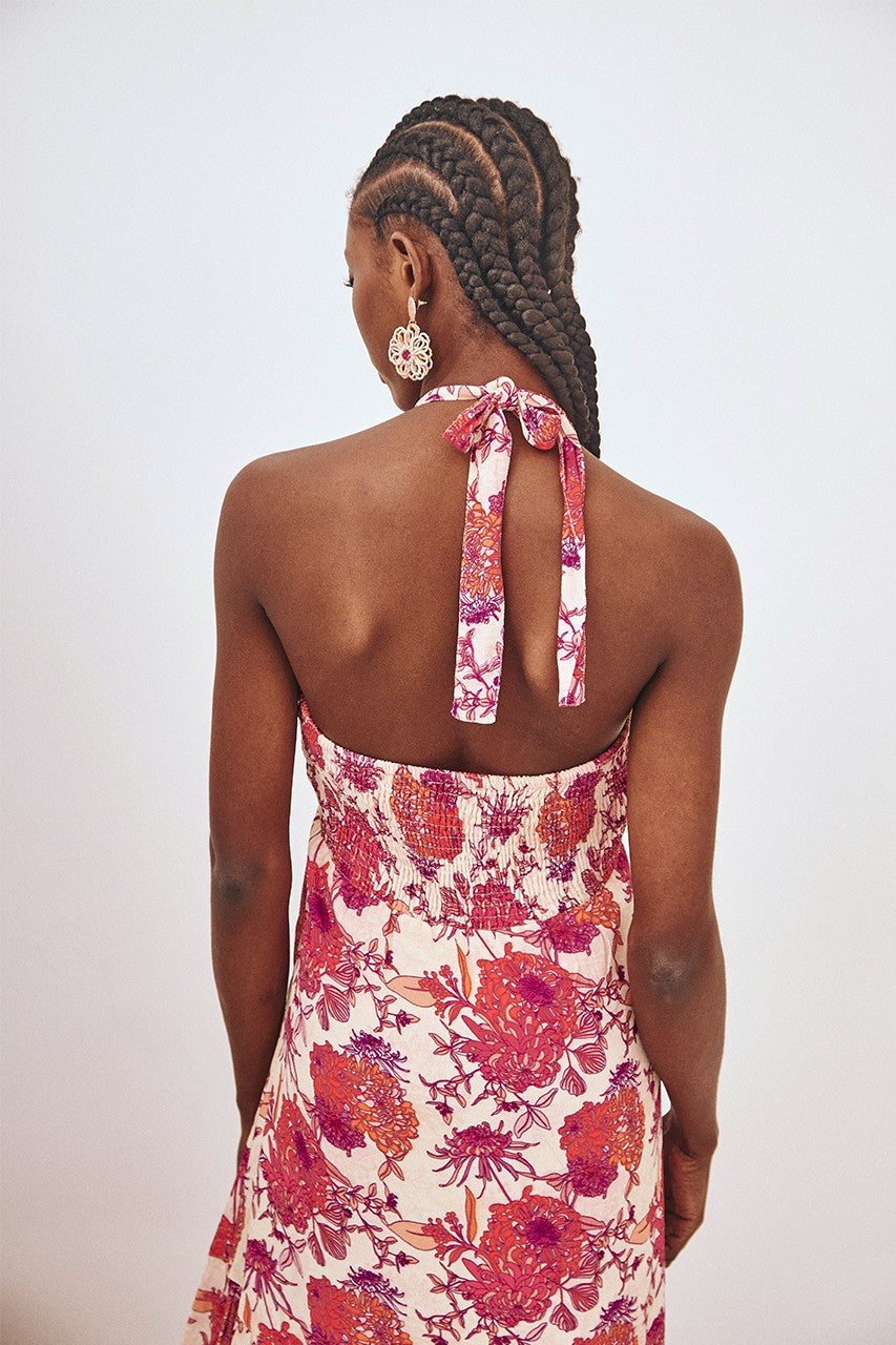 The NKN Asymmetrical Halter Dress is the perfect combination of floral elegance and modern design. The V-neckline and halter neck provide a flattering silhouette, while the gathered waistline adds definition to your figure. The asymmetrical ruffled hem adds a playful touch to this chic dress. Make a statement at your next event with this must-have piece!
