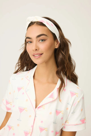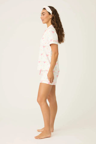Celebrate cozy style with the PJ Salvage Tini Time Drinks Pajama Set. This ivory pointelle knit set includes a short-sleeve button-up top and drawstring shorts, adorned with playful pink martinis and soft pastel flowers. Delicate pink piping and a lace-trimmed drawstring add a touch of feminine charm. Ideal for relaxing at home, a restful night’s sleep, or matching your bridal party with effortless elegance. Embrace comfort without sacrificing style in this irresistibly cute pajama set.