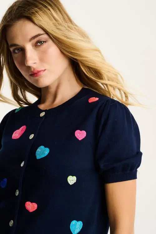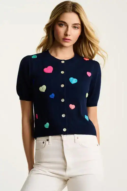 Elevate your everyday wardrobe with the Lisa Todd Royal Flush Cardigan, a timeless piece crafted from 100% cotton. This versatile layer features a classic crew neck, front button closure, and short set-in sleeves finished with ribbed trim at the neckline, cuffs, and hem. The standout detail—delicate beaded heart appliqués adorning the front—adds a touch of refined charm and personality to an otherwise understated silhouette. Perfect for layering over basics or wearing solo, this cardigan transitions seamlessly from season to season.