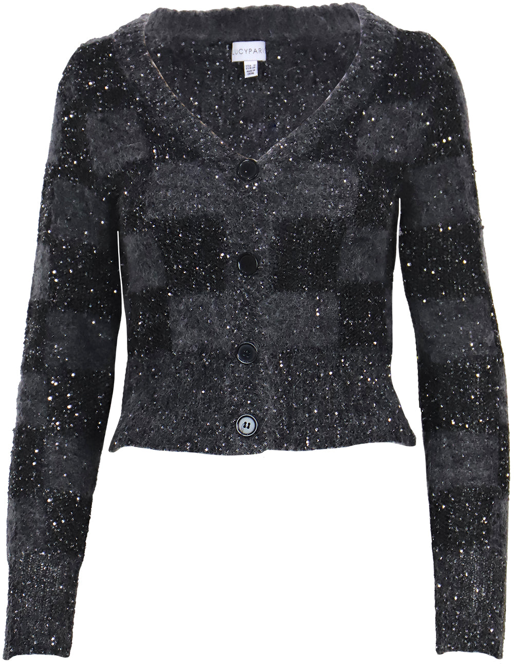 Elevate your wardrobe with the Lucy Paris Glenn Sequin Cardigan, a long-sleeve button-front piece that effortlessly blends style and sophistication. Featuring a subtle black and grey square pattern, this cardigan is adorned with delicate mini sequins that catch the light for a refined shimmer. Perfect for layering, it adds a touch of elegance to any outfit while keeping you comfortable and polished all day long. Make a statement with understated glamour in this versatile, timeless essential.