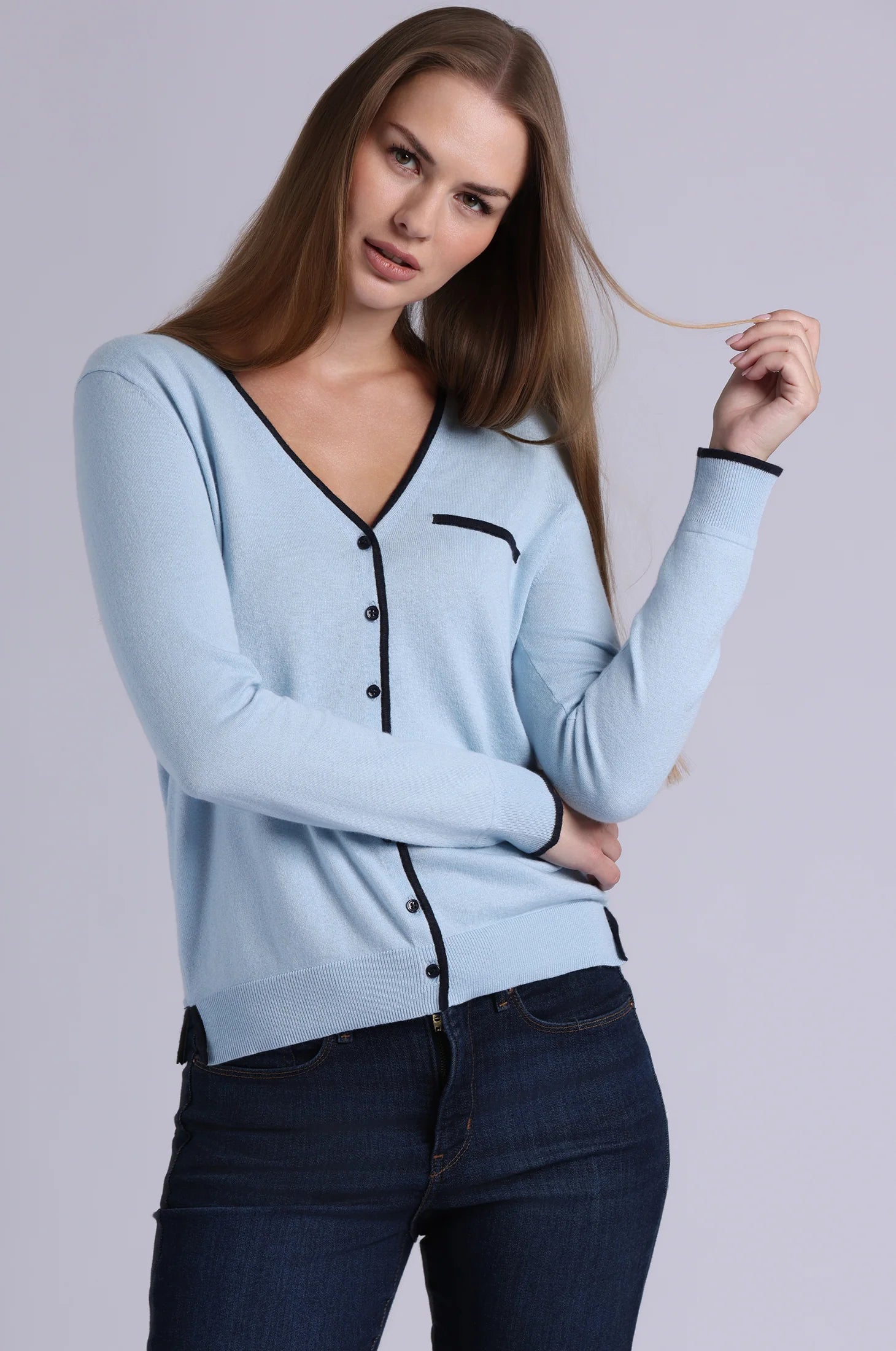 Experience unmatched comfort and style with the Minnie Rose Cardigan with Tipping. Made from a luxurious blend of 85% Supima cotton and 15% cashmere, it offers a soft, breathable feel that keeps you cozy all day long. Its flattering V-neckline and long sleeves create a timeless silhouette, while the playful tipping detail adds a sophisticated twist. Perfect for relaxing at home or stepping out in style, this cardigan is a versatile wardrobe essential you'll want to wear again and again.