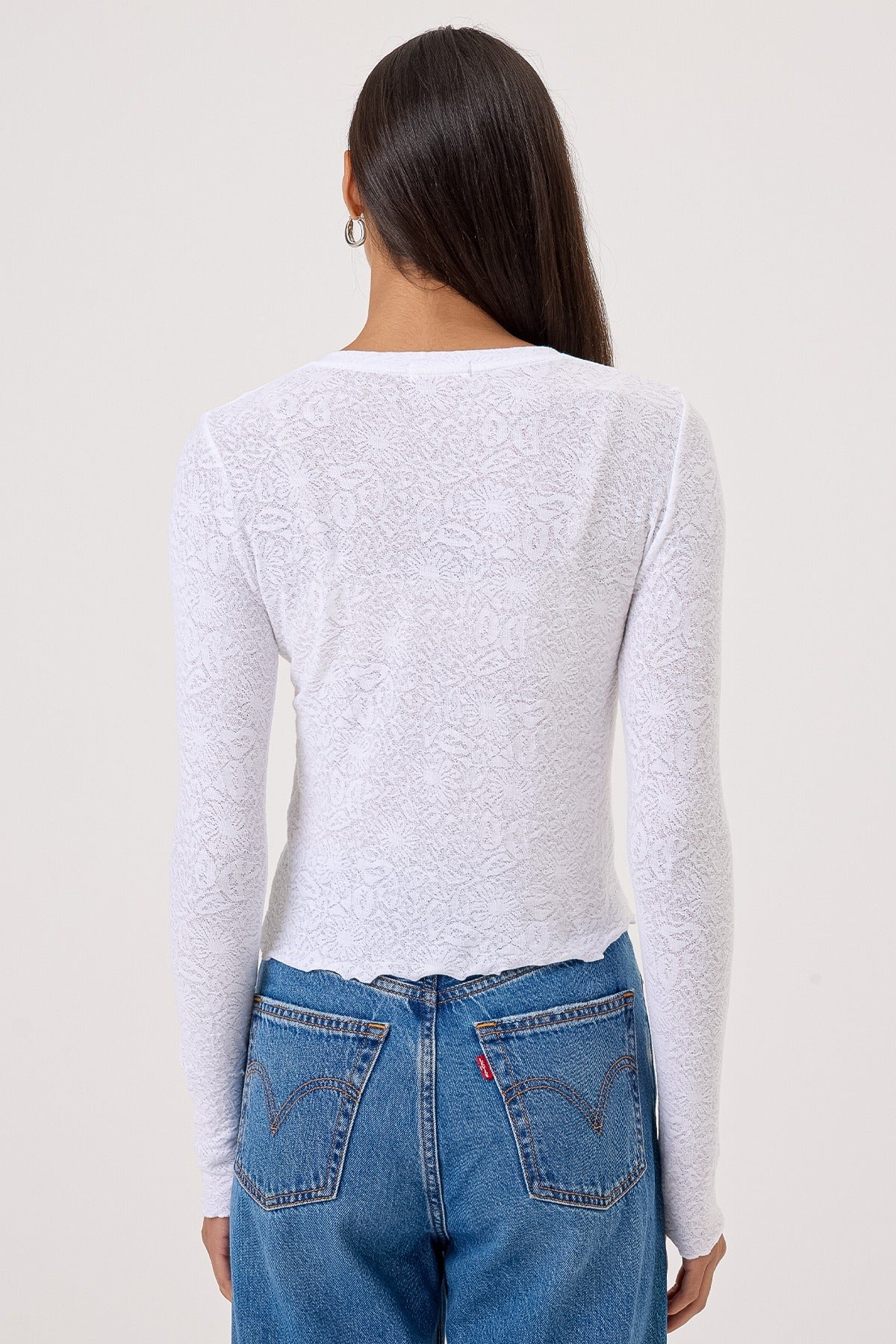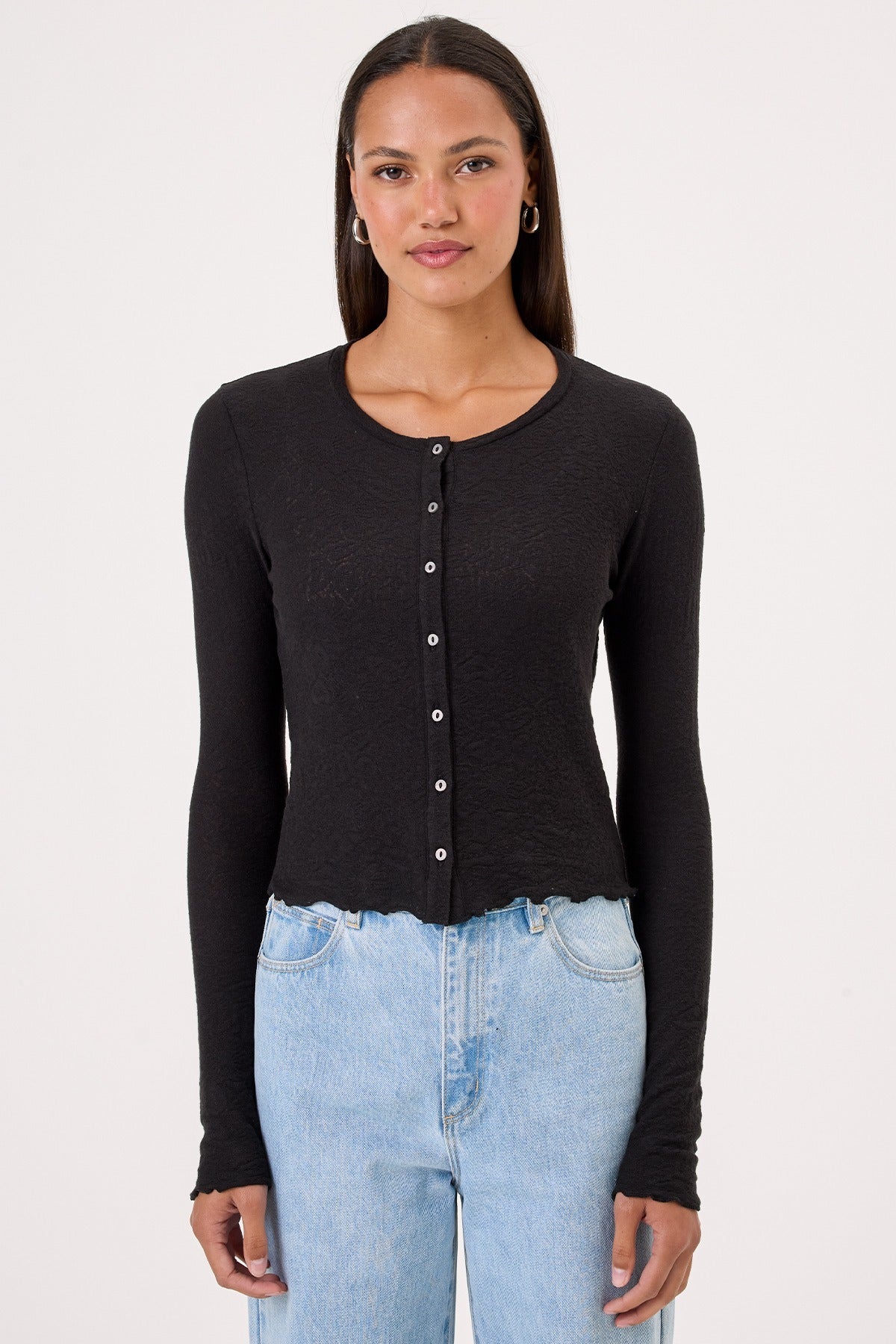 Discover your new wardrobe essential with the Goldie Love Story Cardigan. Crafted from 100% Peruvian pima cotton, this romantic cropped cardigan features an exquisite floral-jacquard knit with delicate lettuce-edge trim that elevates any ensemble. The soft, slightly stretchy fabric drapes beautifully while the body-conscious silhouette flatters your figure and adds an instant touch of sophistication to casual and dressed-up looks alike. Made in Peru with meticulous attention to detail, this piece is designed to become a go-to favorite you'll reach for again and again.
