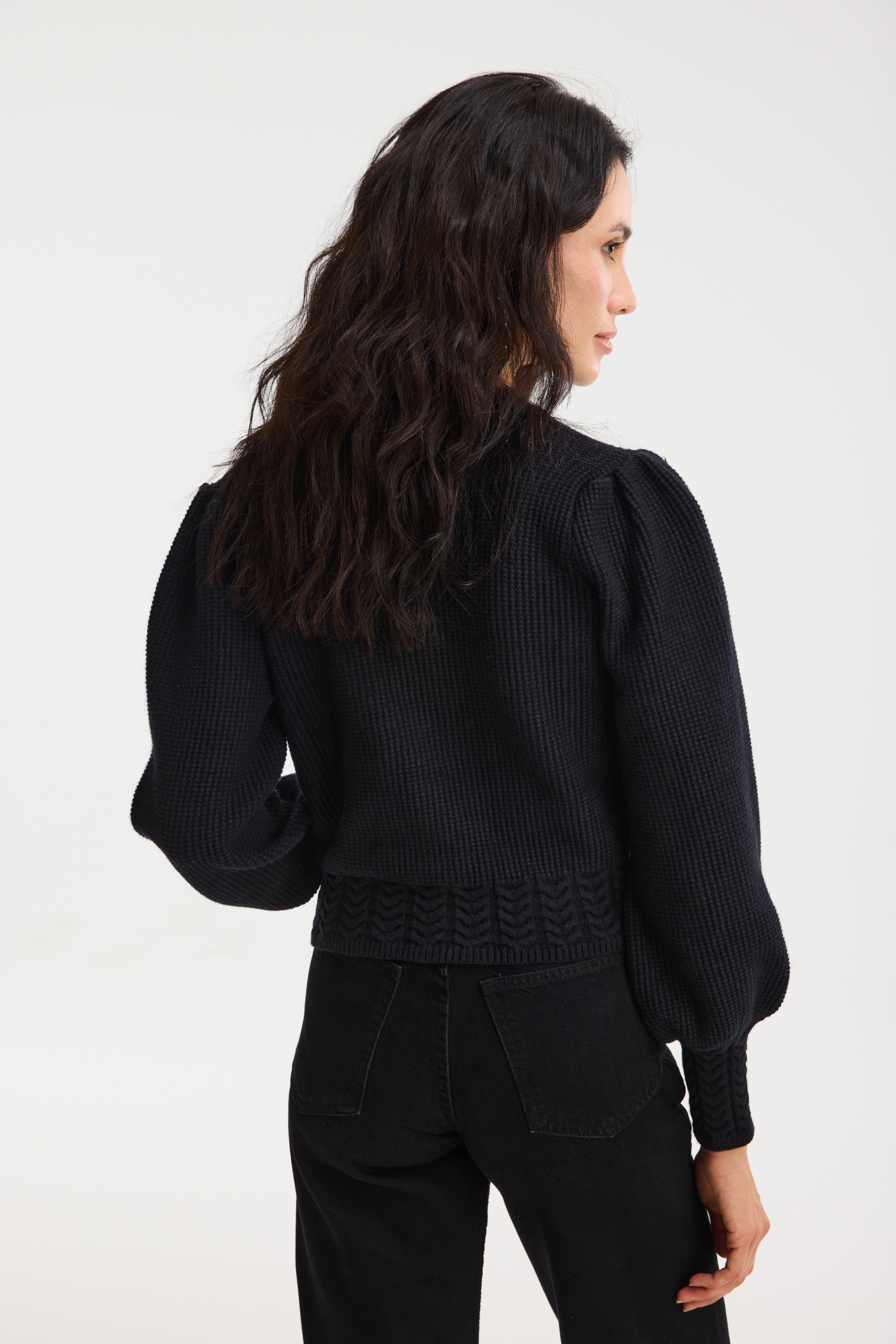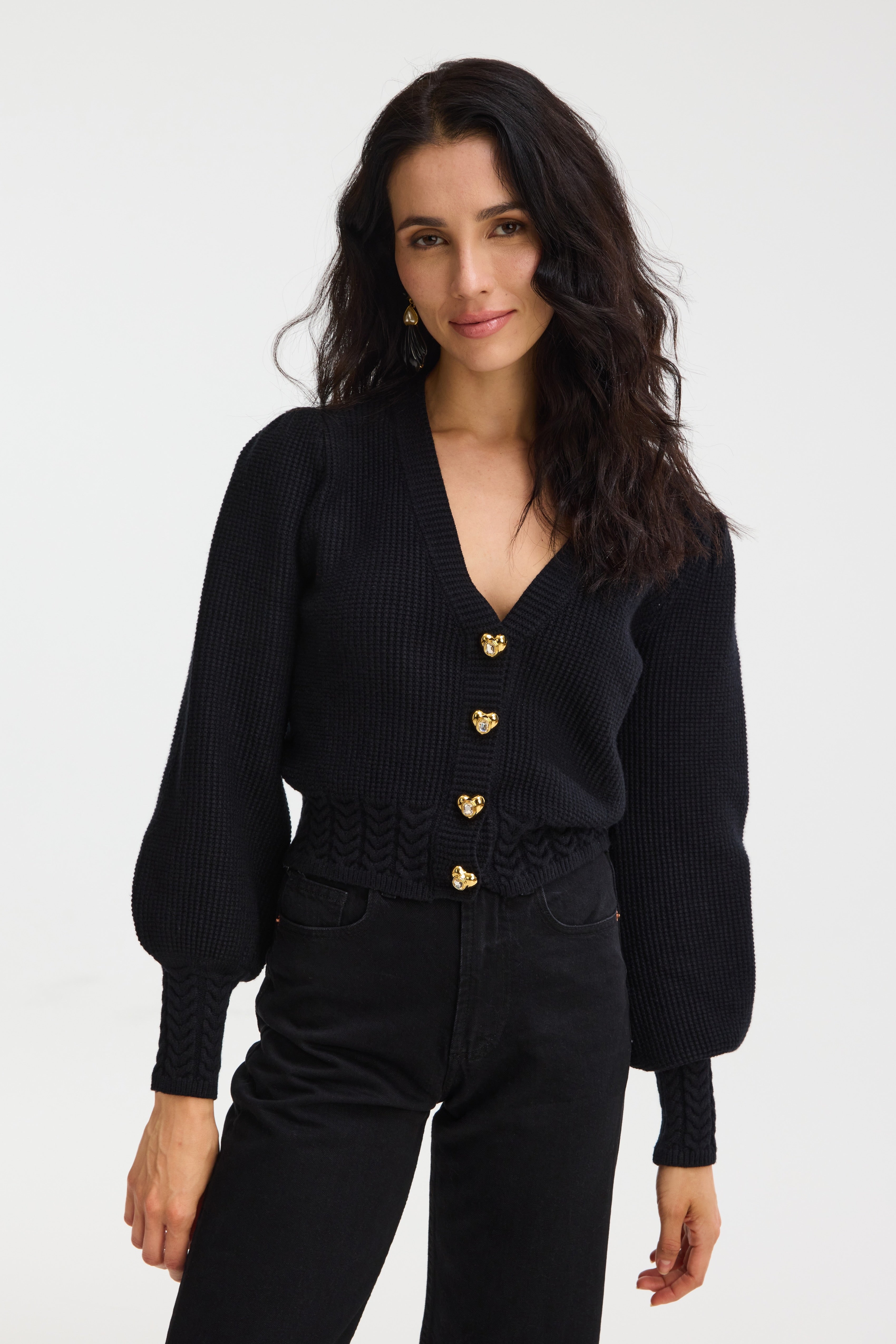 Introducing our bestselling Allison Solid Piper Cardigan—now restocked in classic black. This sophisticated piece features a flattering V neckline adorned with gold heart buttons, each centered with a gleaming stone for an elegant touch. The fitted cable knit band at the hem provides structure, while billowing sleeves showcase intricate cable knit cuffs that frame your wrists beautifully. Slightly cropped for a modern silhouette that pairs effortlessly with everything in your wardrobe. A timeless investment piece that delivers both style and comfort.