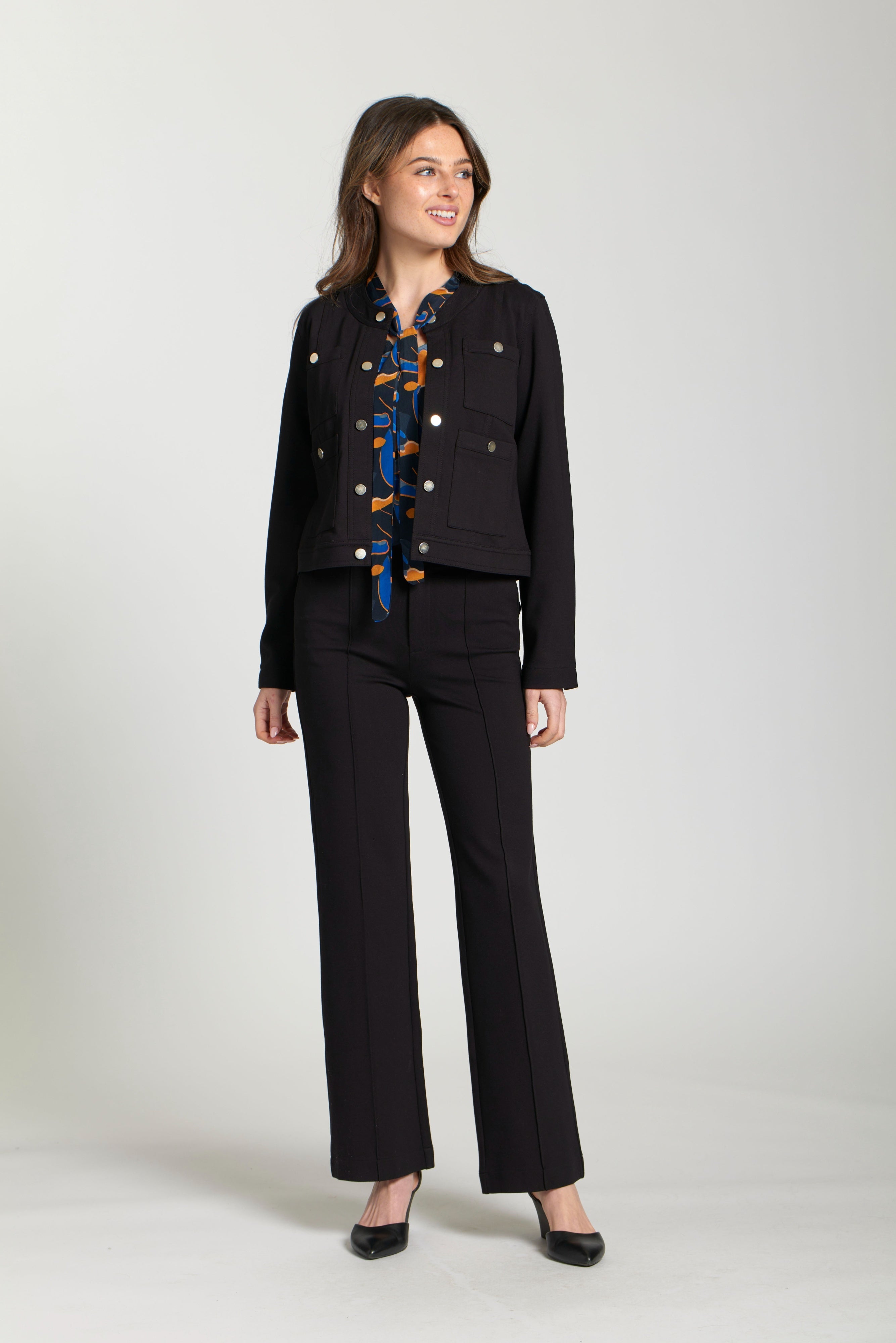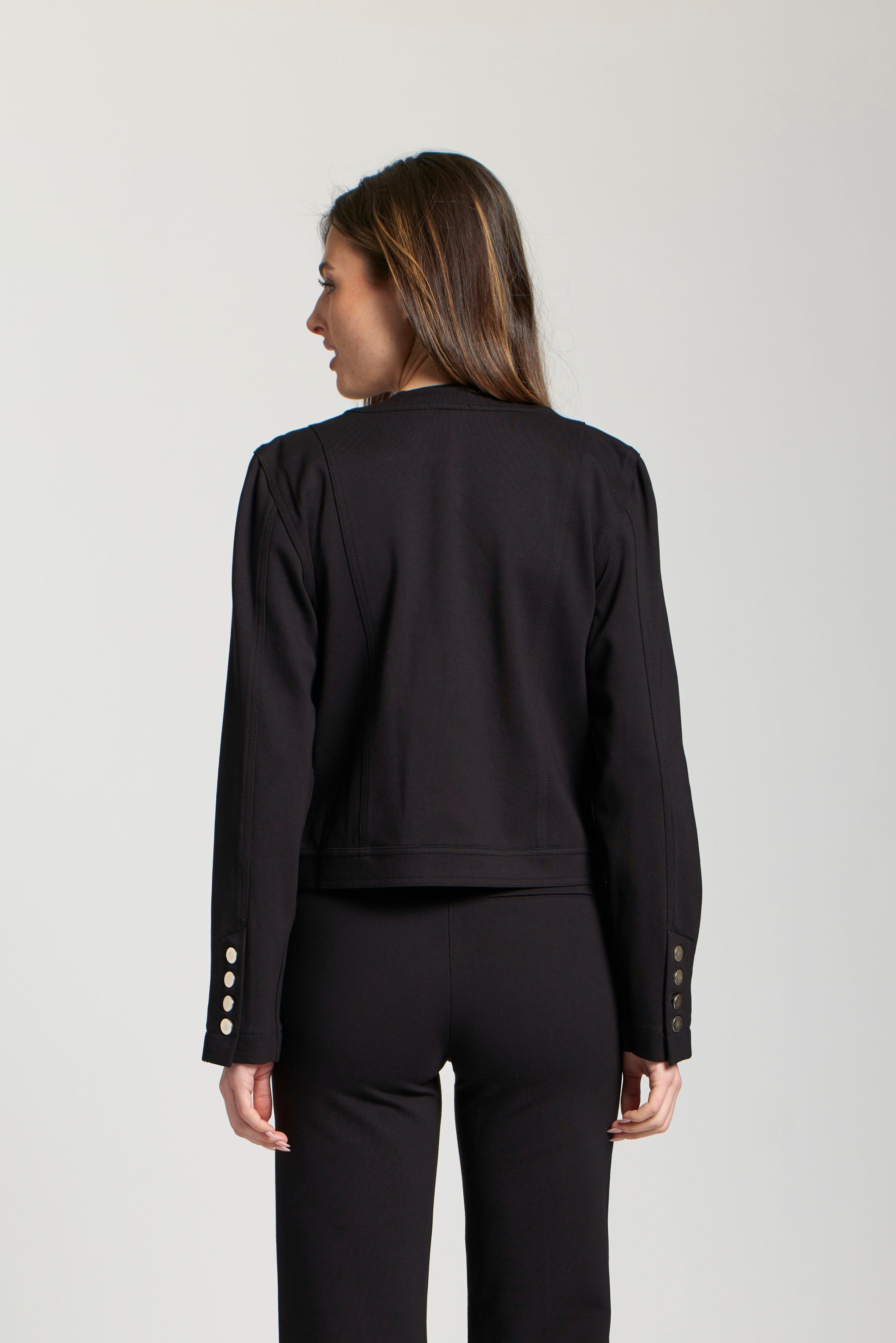 Elevate your wardrobe with the APNY Ponte Collarless Jacket, featuring a sleek collarless design and stylish silver tack buttons. Crafted with long sleeves and four functional pockets, this jacket offers both sophistication and practicality. Its smooth ponte fabric ensures comfortable wear and a polished look, making it perfect for work or casual outings. Add a refined touch to any outfit with this versatile and elegant jacket.