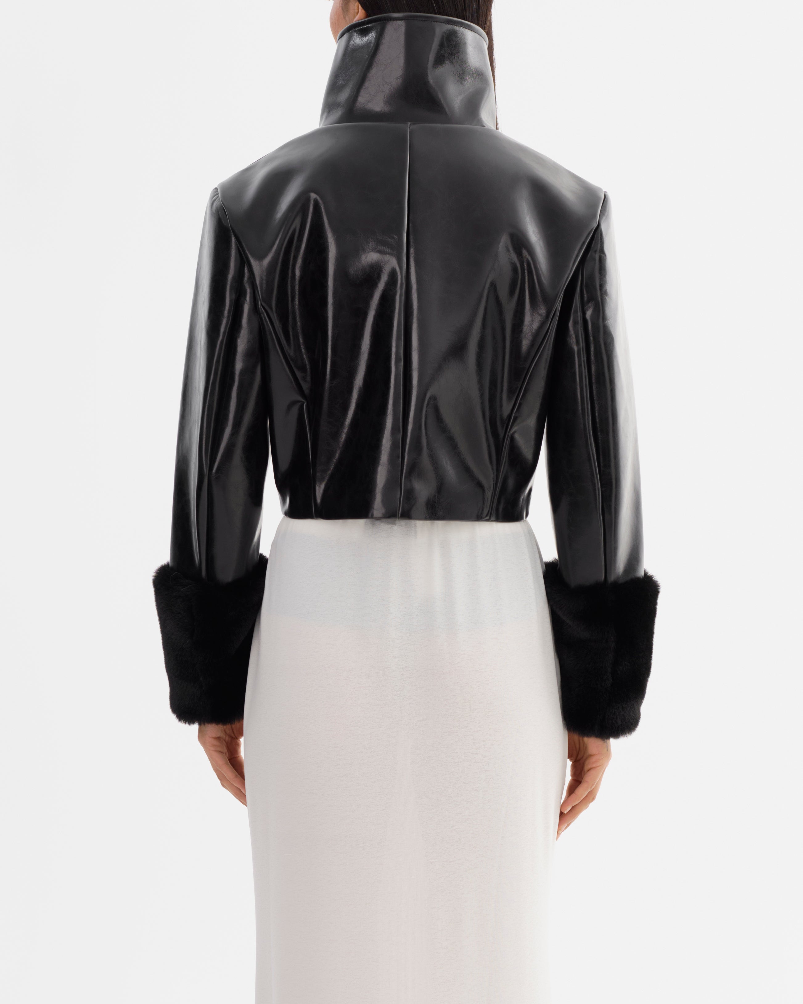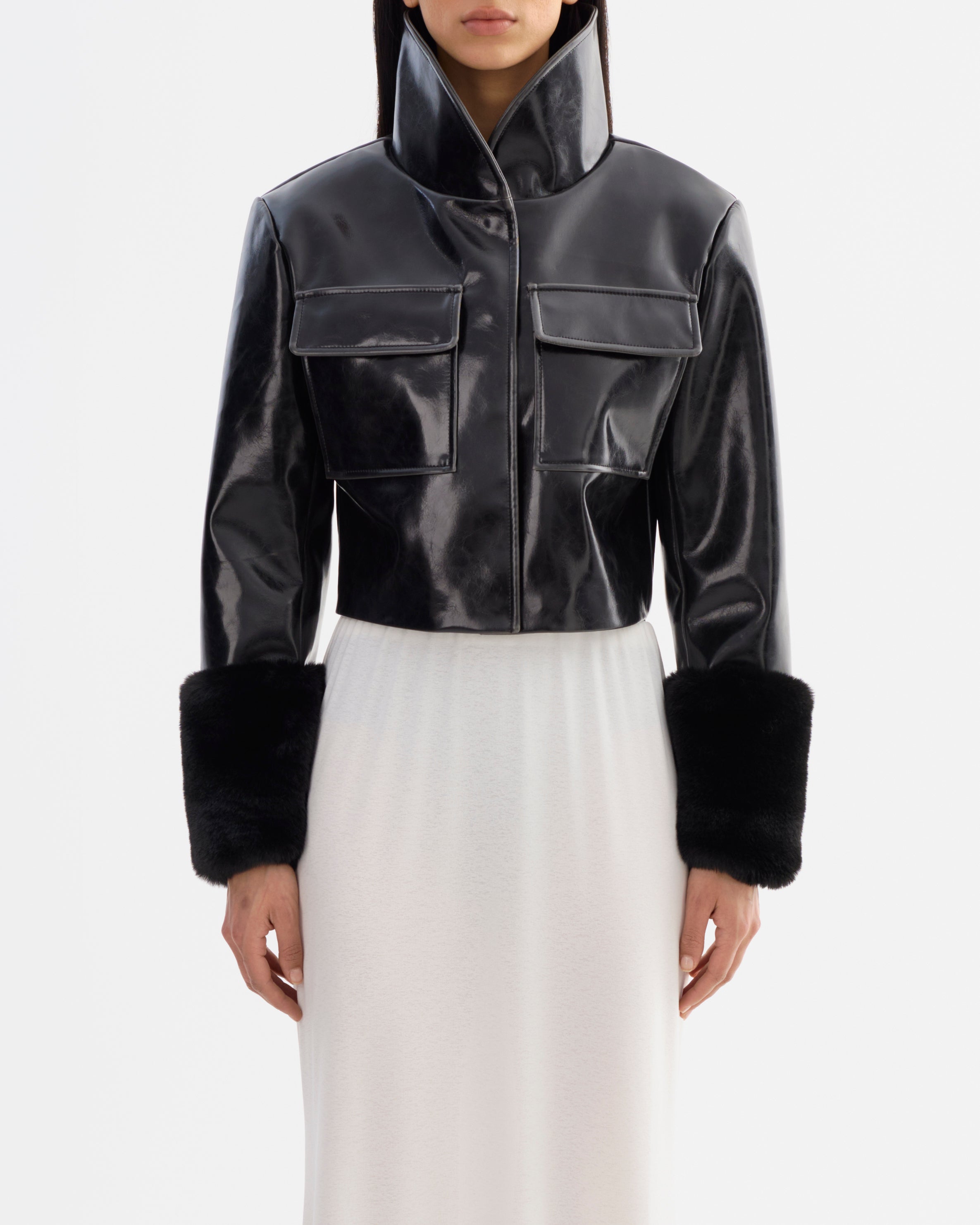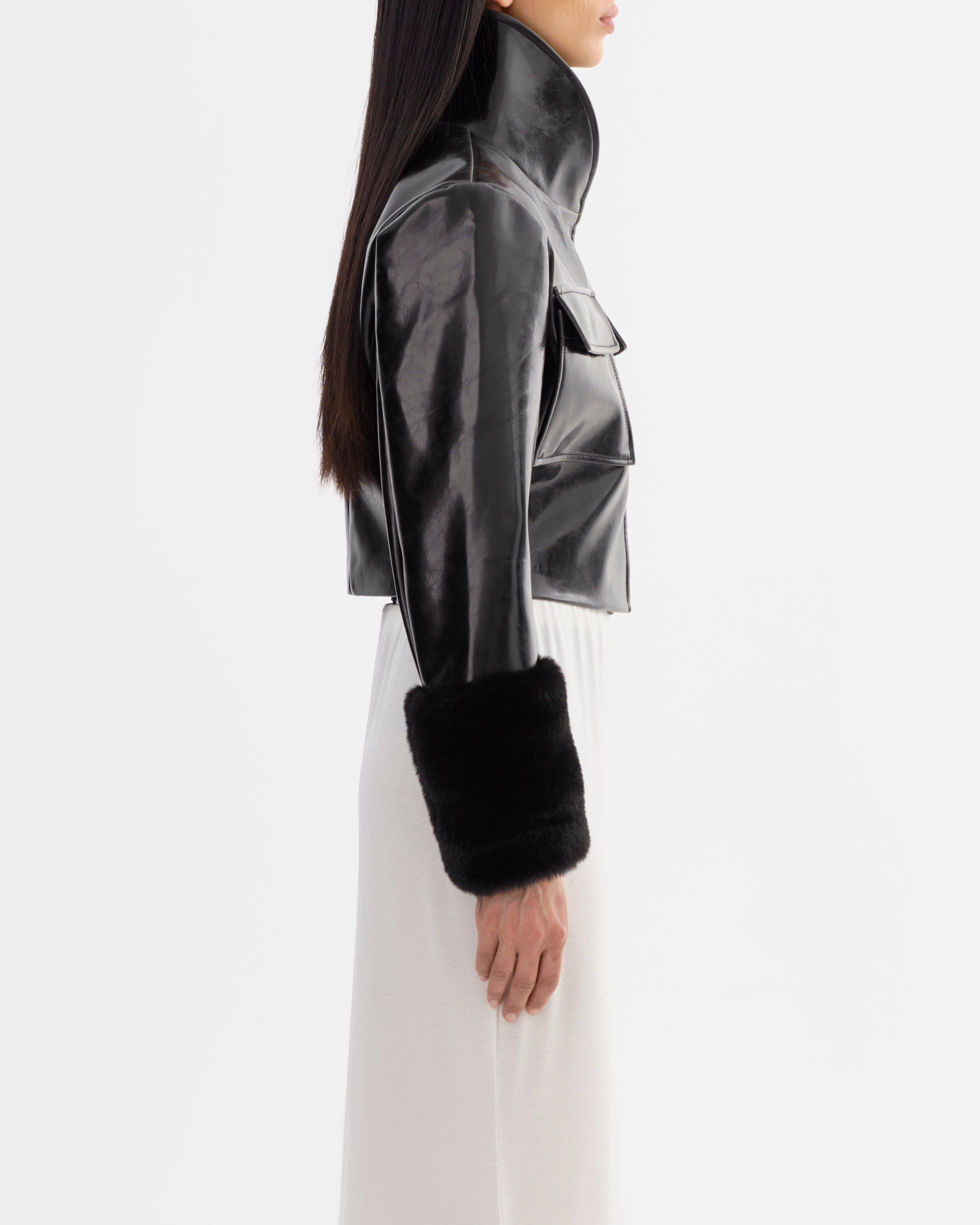 Elevate your style with the Lamarque Hedda Faux Leather Jacket, featuring luxe fur cuffs and a versatile collar that can be worn up for edgy warmth or folded down for a classic look. Designed with two front chest pockets for convenience and a snap front closure for easy wear, this jacket combines fashion with functionality, making it a perfect statement piece for any season.