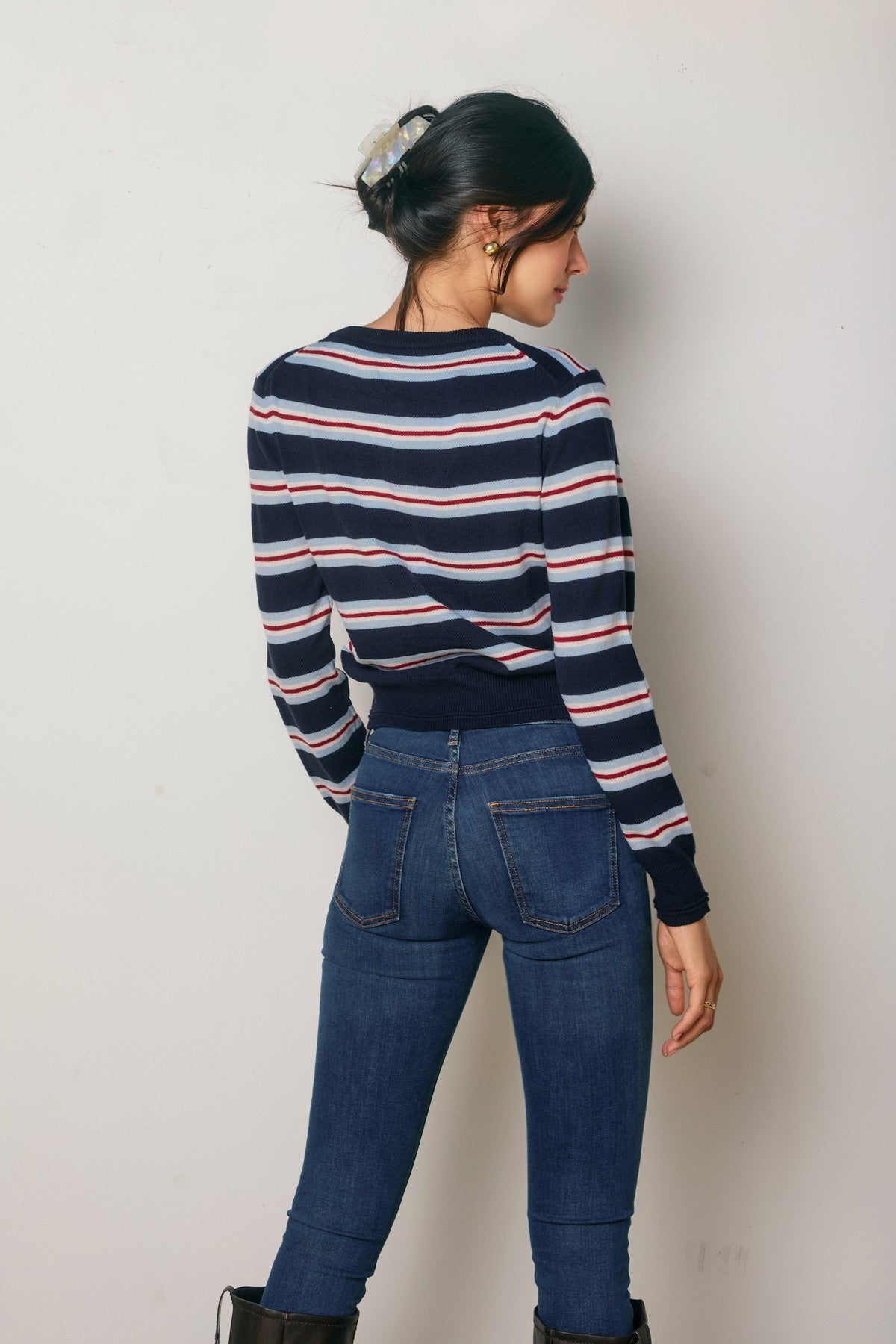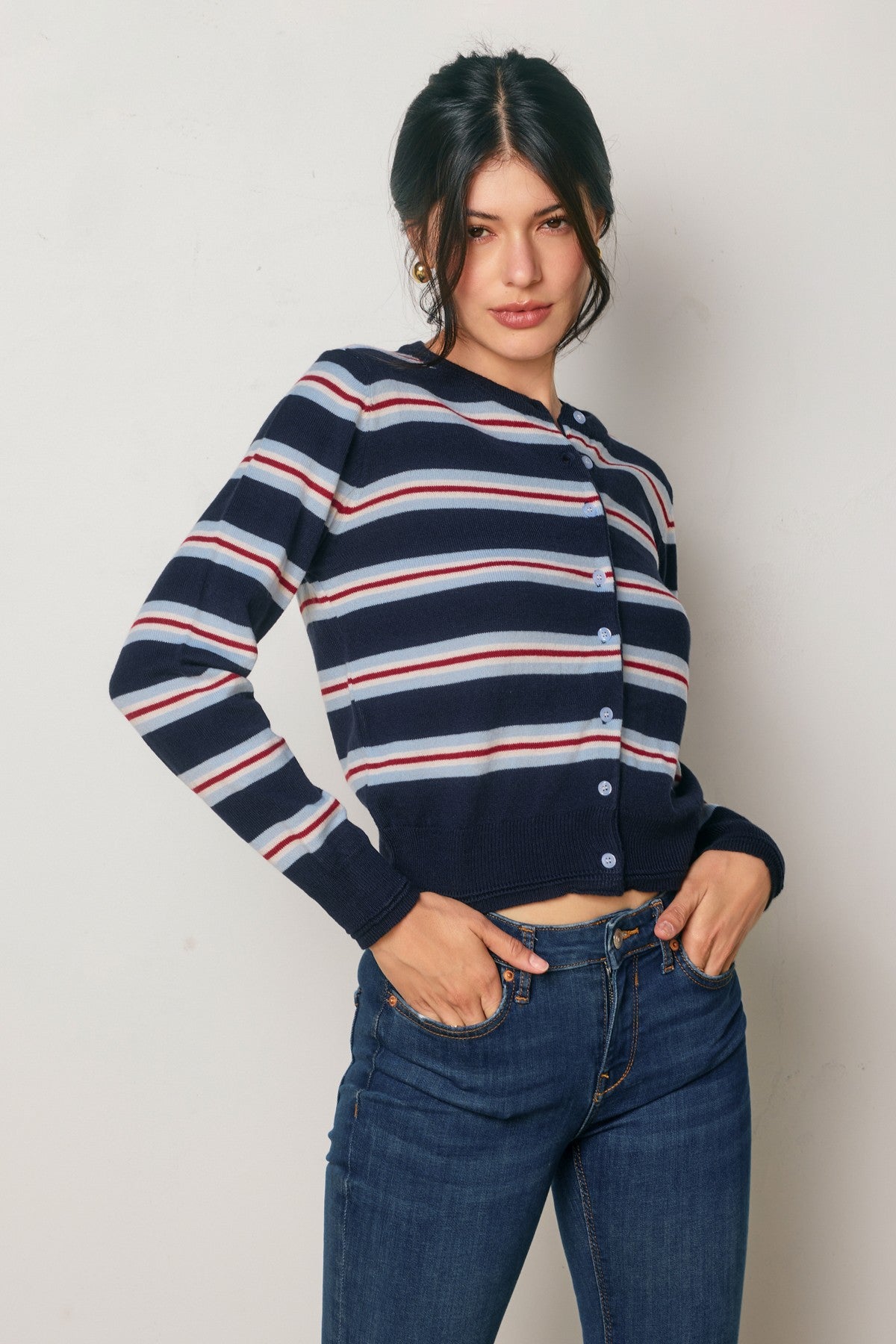 Effortless layering essential with clean lines and timeless appeal. This striped cardigan features a relaxed, basic fit that works seamlessly over tees, dresses, and more. Button-down front closure with no pockets keeps the silhouette streamlined. Unlined construction offers breathable comfort, while the absence of elastic or smocking details maintains a refined, understated aesthetic. Perfect for building a versatile wardrobe foundation.