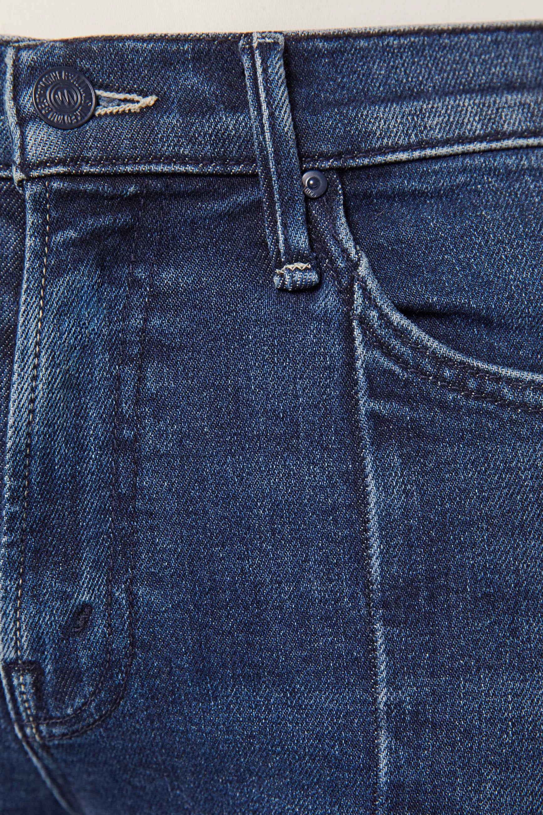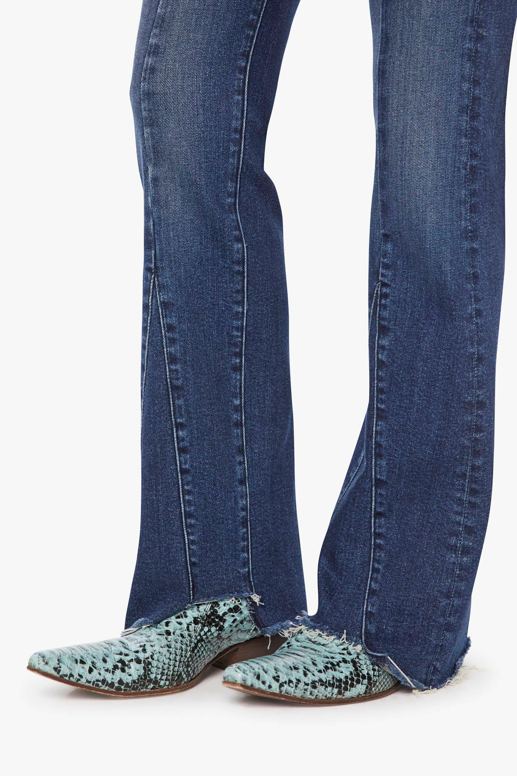 Step into confidence with the Mother Insider Skimp Pointy Fray Jeans in You're A Riot. These high-waisted bootcut jeans offer a flattering fit with a zip fly and stylish seamed details along the front. Crafted from stretch denim, they ensure comfort and flexibility for all-day wear. The 31-inch inseam and unique frayed triple step-hem add a trendy edge, while the dark blue wash with subtle whiskering and knee fading creates a cool, lived-in look perfect for standing out at any event. Make every moment unforgettable in these standout jeans.