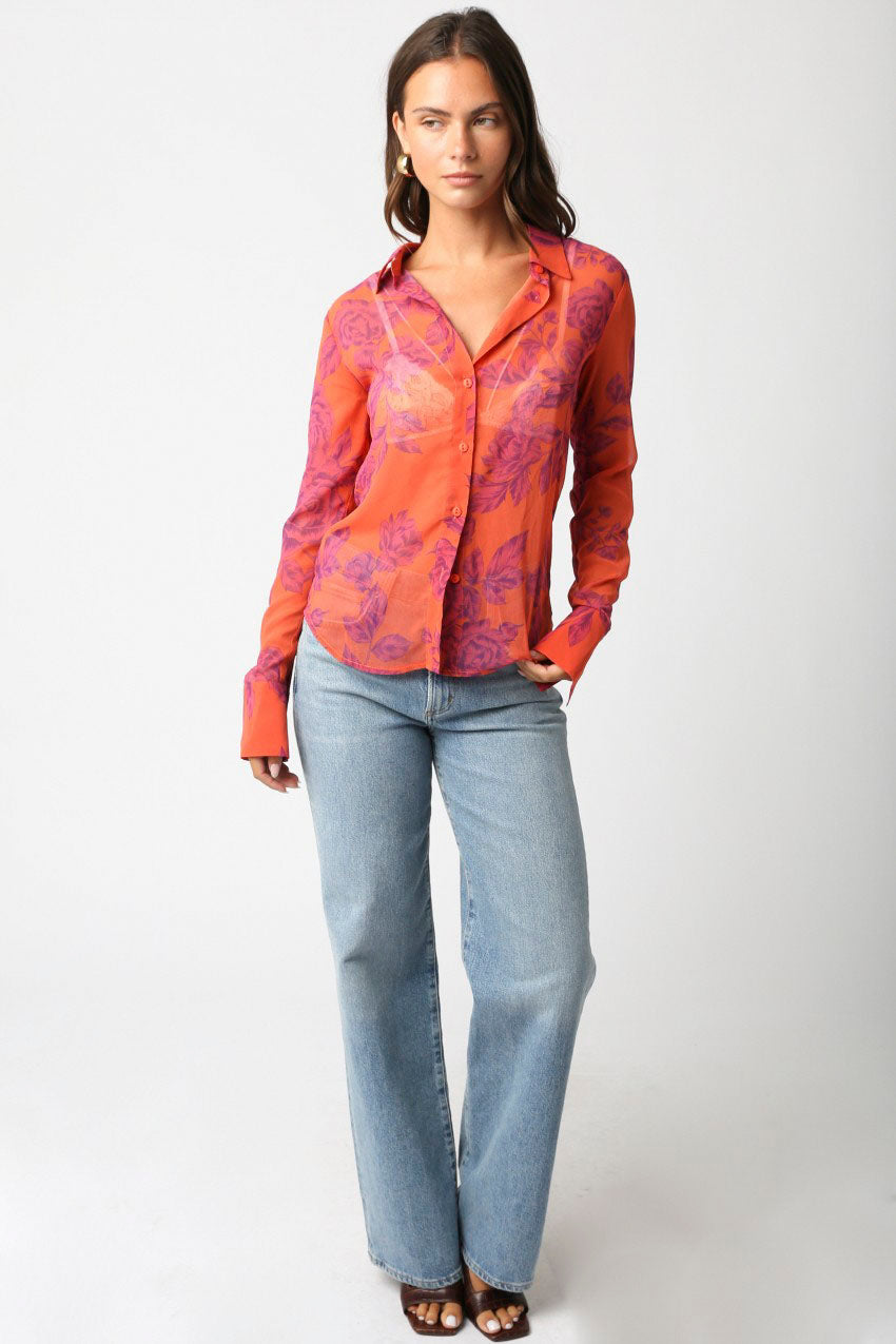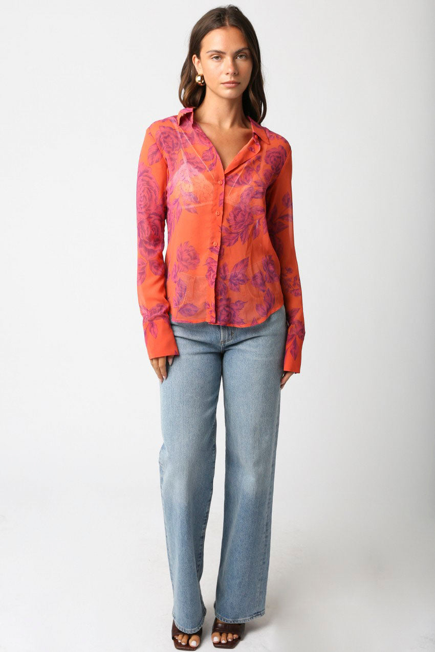Elevate your style with the Olivaceous Talia Floral Mesh Button Down Shirt. This vibrant orange shirt showcases a delicate magenta floral print on sheer mesh fabric, creating a lightweight, breathable feel. The classic button-down design adds a polished touch while the eye-catching colors make it perfect for standing out effortlessly. Ideal for layering or wearing solo, it brings a fresh, feminine vibe to any wardrobe.